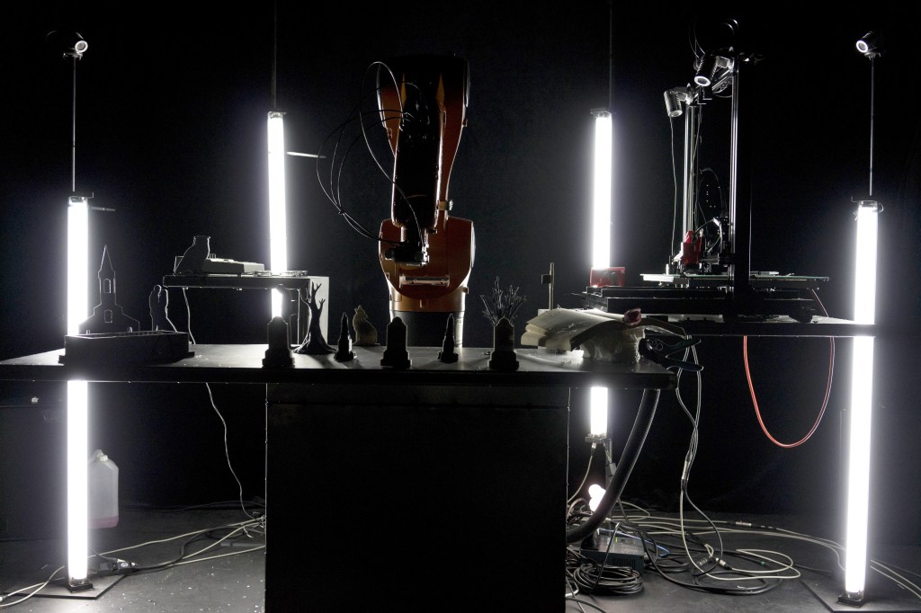 Trois installations se révèlent à nous comme les facettes d’un même rêve éveillé, habité par d’hallucinantes marionnettes. Voix synthétiques, va-et-vient des imprimantes 3D, flux d’images et mouvements millimétrés d’un robot-scénographe composent une partition inédite qui vient s’imprimer jusqu’au plus profond de nous-même.
